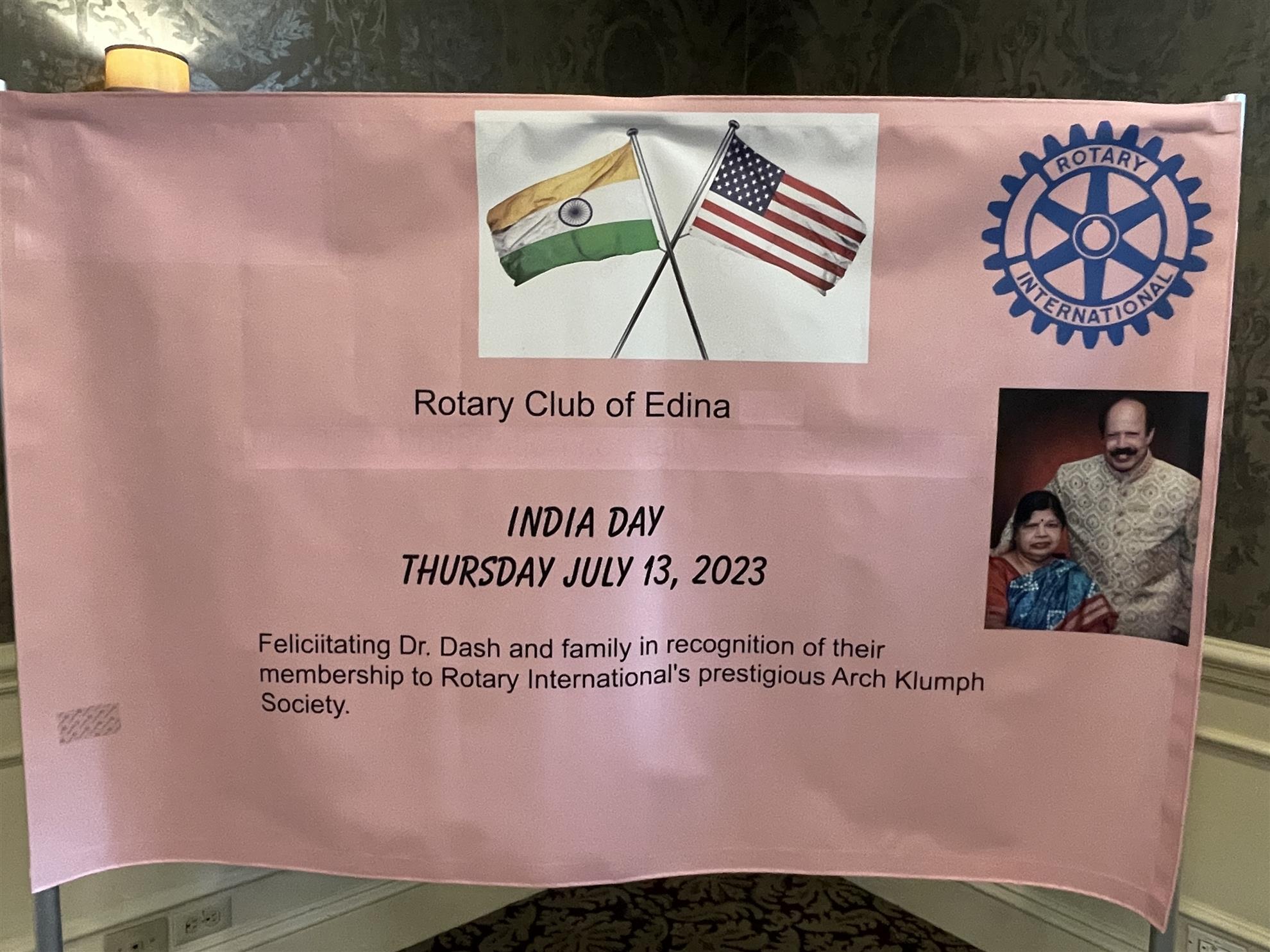 Dr. SK and Kaplana Dash were recognized for their substantial contributions to Rotary International and became members of the Arch Klump Society as part of our July 13, 2023 Rotary meeting. Friends, colleagues, members of the Rotary Club of Edina, Rotary Club of Maple Grove, Wayzata Rotary Club, current and past District 5950 governors and other local dignataries including a video message from Senator Amy Klobuchar joined in celebrating Dr. Dash's generosity and spirit. Senator Klobuchar's message can be seen HERE.