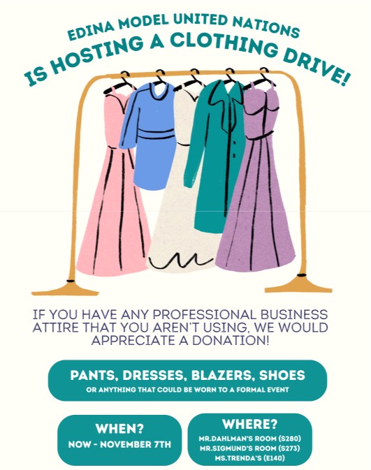 Edina Model United Nations is holding a clothing drive for professional business attire. Our delegates are required to wear business attire to all conferences. In an effort to remove any barriers, we are holding a clothing drive to collect suits, collared shirts, ties, belts, shoes, pants, skirts, and anything else to pass on to our delegates who might need some clothes for our first conference on Friday, November 14.